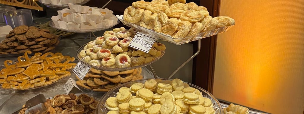 Traditional pastries showcasing airy palmier, cream-filled wafers, and baklava, among others.